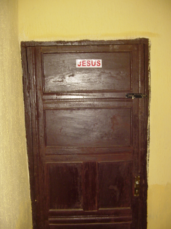 <a href="/media/Nigeria/NTI/ZonalAug07/JesusDoor_w.jpg"><img src="/media/Nigeria/NTI/ZonalAug07/JesusDoor_t.jpg" title="Hotel toilet door in Enugu" alt="" /></a>