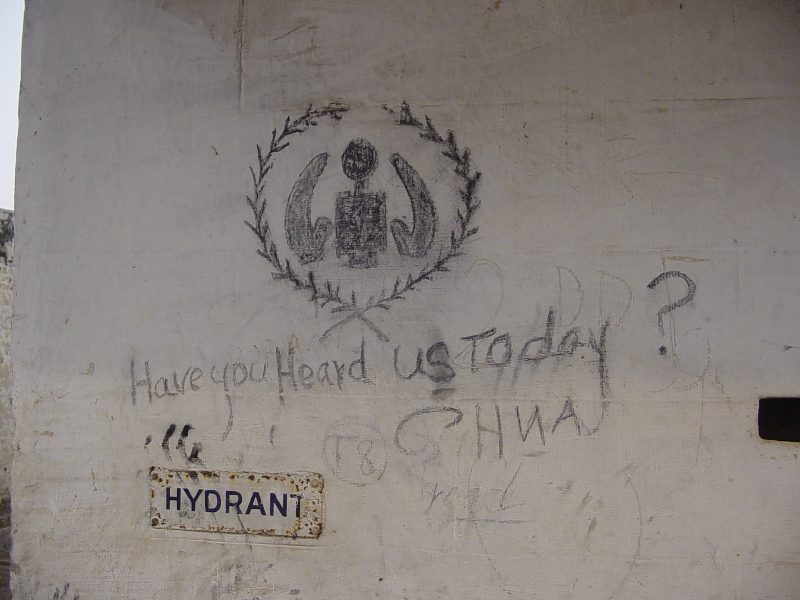 The fort had many small cells that had at one time held twenty prisoners, or even more slaves. Sudanese refugees had lived in the fort for a while after the prison was closed, leaving their graffiti mingled with that of the prisoners. The caretaker showed us what appeared to be a former motor workshop where apparently Jerry Rawlings had coup plotters killed by a short drop hanging over the inspection pit with a bit of electrocution to finish them off.